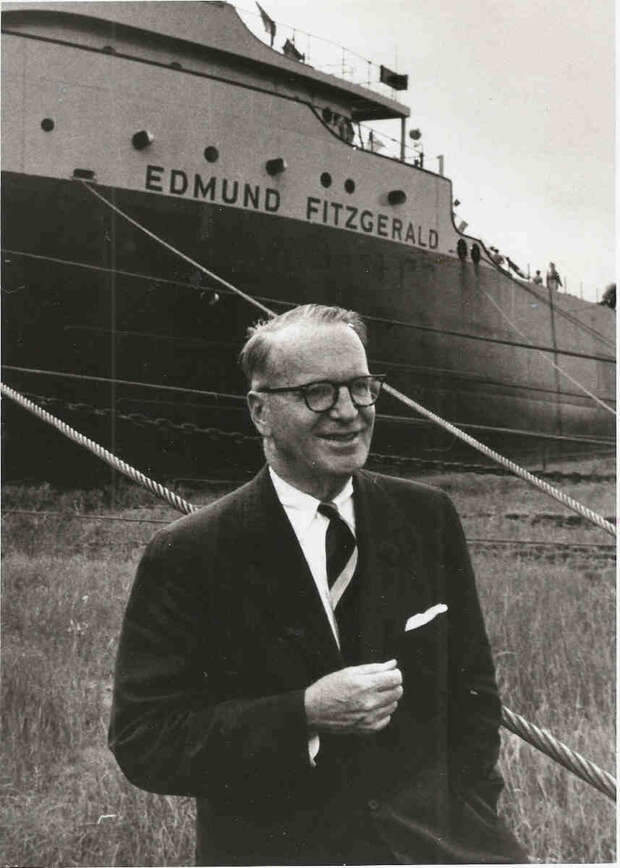 В данном случае — именем её мужа Эдмунда Фицджеральда, занимавшего пост президента страховой компании Nortwestern Mutual Life Insurance Company, инвестировавшей денежные средства в постройку корабля. Это он стоит позади Элизабет на снимке. Дед Эдмунда сам был капитаном судна, ходившего по Великим озерам, а его отец владел судостроительным предприятием в Милуоки, так что Эдмунд лично тоже неплохо приобщился к корабельной теме.