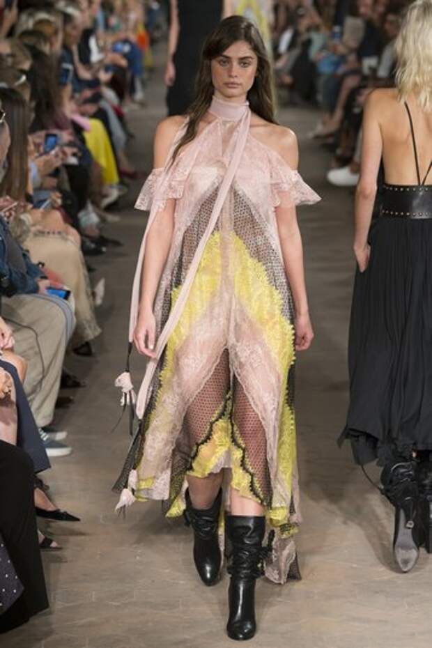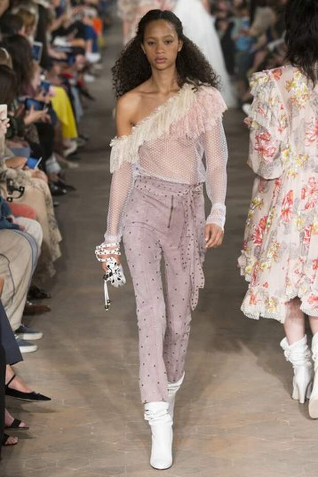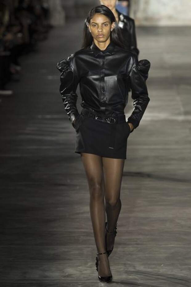 Помимо продолжения буйного цветения, я бы отметила еще несколько основных трендов этой весны. Перфорированная кожа с металлическими пуговицами и экстремальные кожаные мини возвращают нас назад к 1980-м. С такими юбками всегда отлично смотрелись романтические шелковые блузки (например, в кокетливый девичий горошек) с высокими стойками-воротниками, переходящими в мягкий бант.