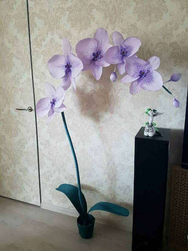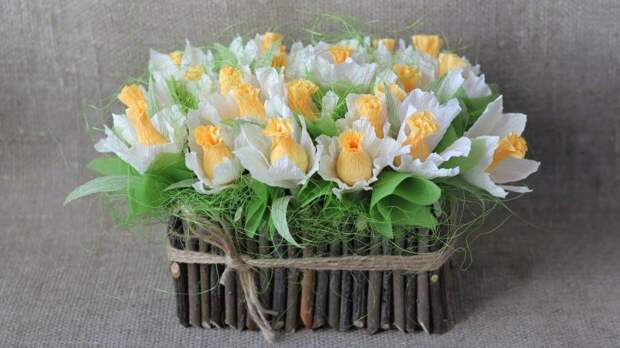Научившись делать цветы и бутоны из креповой бумаги, несложно изготовить топиарий из заранее подготовленных элементов.