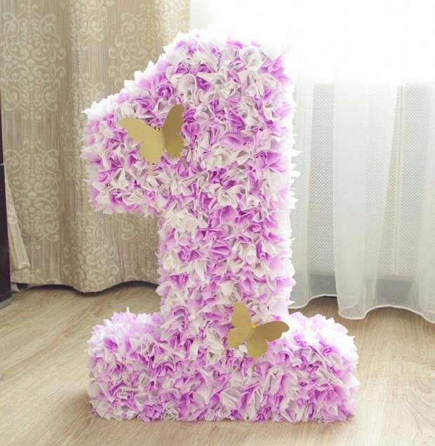 Из бумаги формируются цветы или бутоны, уголки или шарики, ними в последующем оклеиваются сформированные из картона каркасы, имитирующие форму букв, цифр или геометрических фигур.